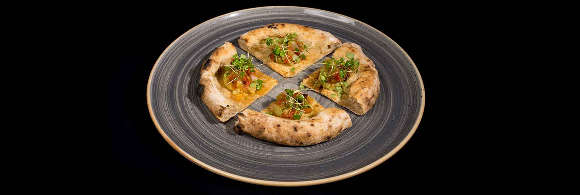 Va da sé che il mondo della pizza d’autore, attento ai trend, ha seguito quella dell’alta cucina con topping plant-based spesso ricercati e soprattutto golosi. Si può dire che – come spesso accade – un antesignano importante di questa tendenza sia stato Denis Lovatel che con il suo progetto In-fusioni del 2016 (12 pizze con 12 chef differenti per 12 mesi) ha creato insieme a Francesco Brutto, attualmente chef di Venissa, la Pu’er, pizza bianca che, fiordilatte a parte, era tutta vegetale: topinambur al forno, chips di cavolo nero, succo di cavolo nero e infuso di tè Pu’er, una varietà cinese che subisce un trattamento di post-fermentazione. Sua anche la Rivoluzione Vegetale, come la Pu’er nuovamente premiata qualche anno dopo, nel 2020, dal Gambero Rosso: nasce proprio per sostituire le proteine vegetali a quelle animali, immaginando un’alternativa che rappresentasse esteticamente bresaola, rucola e scaglie di Grana. Come? Realizzando un carpaccio di anguria trattato con una tecnica particolare di lunga cottura a bassa temperatura e un complesso processo di disidratazione ideato da Andoni Luis Aduriz del Mugaritz, aromatizzato con spezie di montagna e un olio alla brace e finita con timo e rosmarino in osmosi.